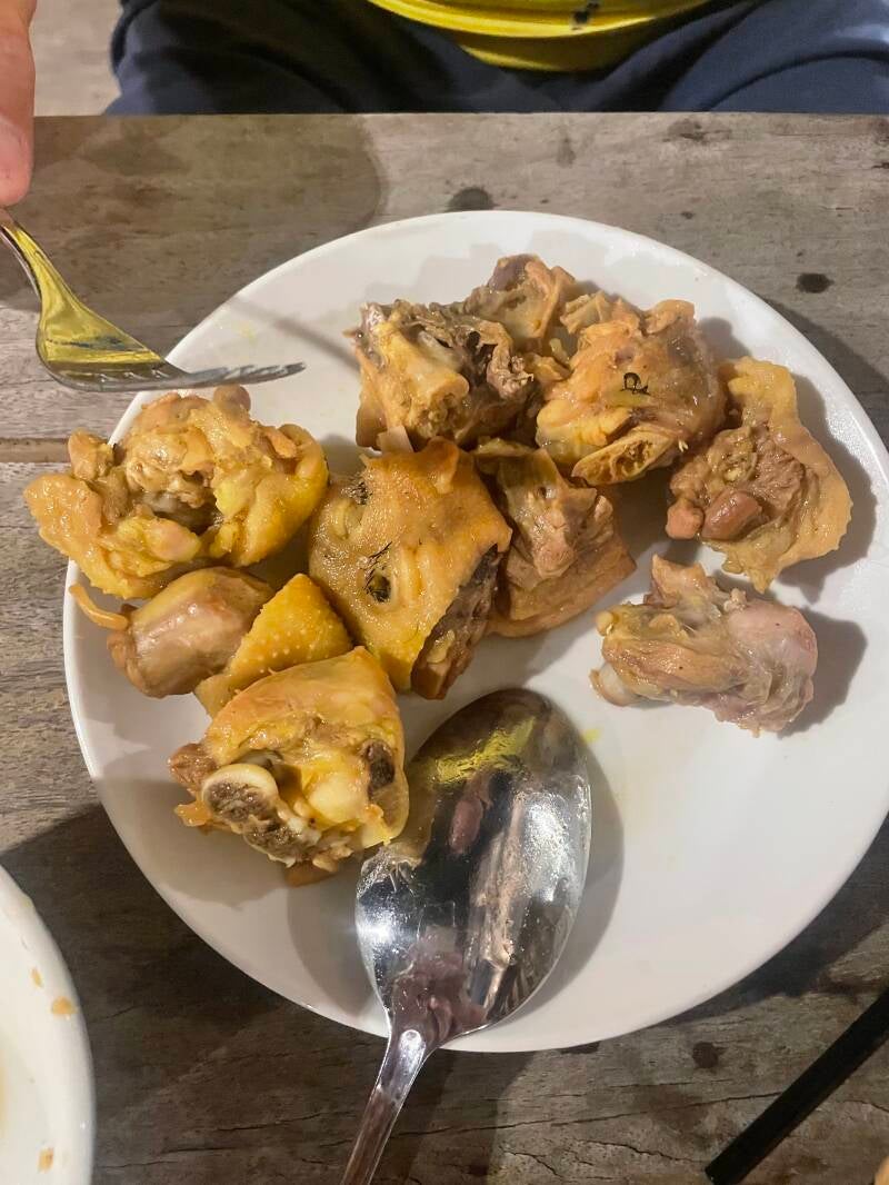 Above: Gristly "meat" from a largely inedible "chicken" dish (at one of our pricier hotels)